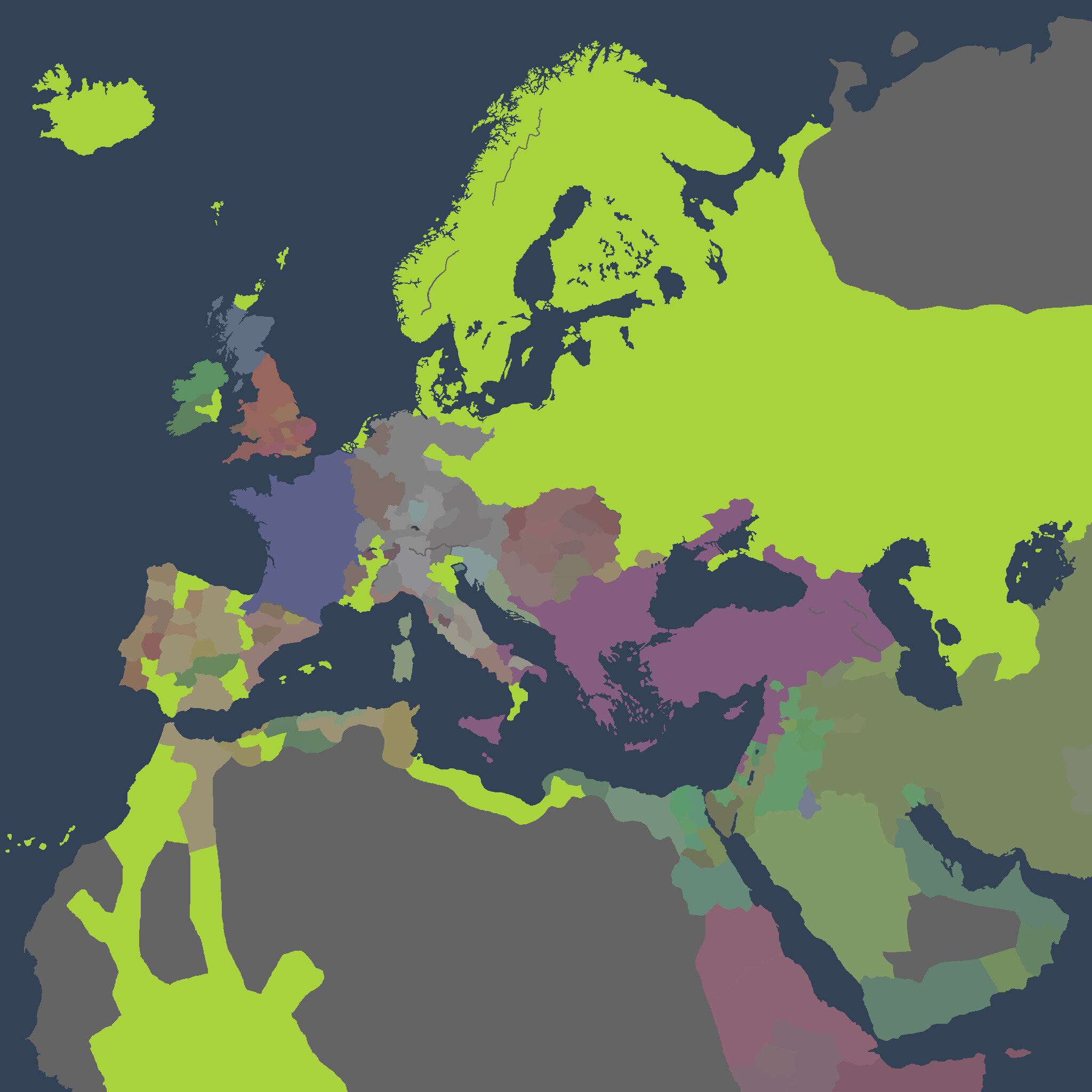Выборная монархия сыграла с Византией плохую шутку, так как имперский титул унаследовал русский император. Испания влилась в состав России, благодаря походам одного из русских князей. Венгрия завоёвана Священной Римской Империей, Британия ей же унаследована. После преодоления Схизмы Франция, являясь последним крупным католическим государством, поделена между Россией и СРИ. Хотя и получила суверенитет от последней. Ильханат постепенно утрачивает свои позиции на Ближнем Востоке.